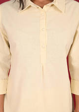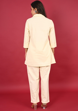 Elevate your office wardrobe with this stylish off-white shirt and pant set, made from a comfortable cotton flex blend (85% cotton, 15% linen). The shirt features a classic collared neck, long sleeves, and a button placket, while the slightly curved hem adds a modern touch. Paired with trousers that include two pockets, this set offers a sleek, professional look perfect for work or formal settings.