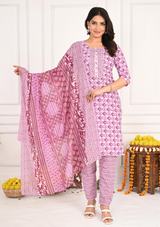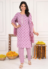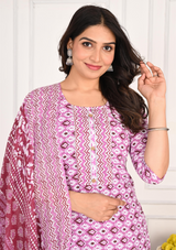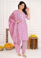 Elegant Purple Buta Print Cotton Kurta Set with Zigzag Pant & Dupatta