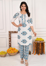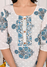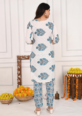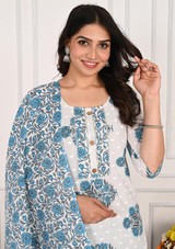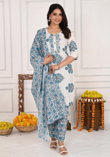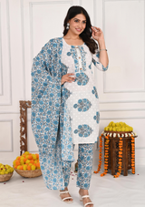 Whether it's for a casual day out or a semi-formal gathering, this Blue Floral Off-White Cotton Kurta Set with Full Floral Print Pants and Dupatta will have you feeling chic and comfortable all day long.