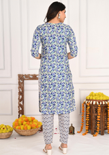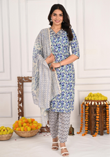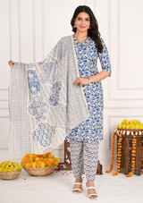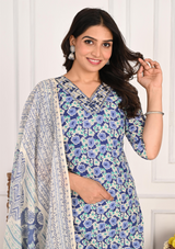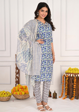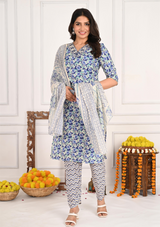 Whether you're attending a festive celebration or a casual outing, this Floral Print Blue Rayon Kurta Set with Zigzag Pants and Dupatta is a must-have addition to your wardrobe. Make a statement with effortless style and comfort – order yours today!