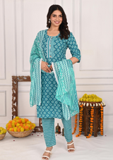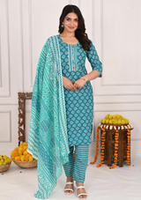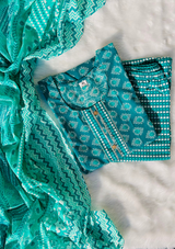 Infuse your ethnic wardrobe with a timeless blend of tradition and contemporary style with this green buta print kurta set. Crafted from soft, breathable pure cotton, the kurta features delicate buta prints in a rich green hue, exuding a serene and sophisticated vibe. The modern checked pants add a fresh, chic contrast to the traditional design, while the complementing dupatta completes the ensemble with an elegant touch. Perfect for casual outings, festive gatherings, or semi-formal events, this set offers comfort, elegance, and versatility.