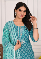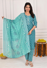 Charming Green Buta Print Cotton Kurta Set with Checked Pant & Dupatta