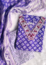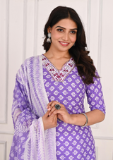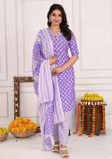 Charming Purple Sequins Work V-Neck Cotton Kurta Set with Zigzag Pant & Dupatta