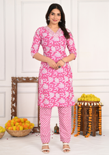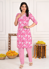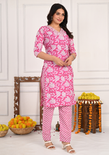 Charming V-Neck Floral Pink Kurta Pant Set – Effortless Elegance