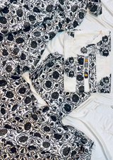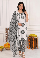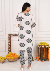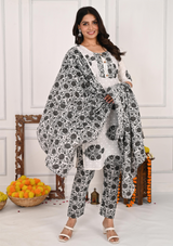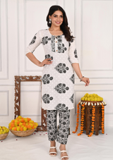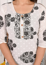 ✨ Set Includes: ✔ Kurta: Delicate black floral print on soft, breathable white cotton, offering a fresh and elegant look. (Length: 44 inches)