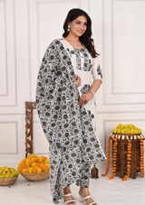 Elegant Black Floral on White Kurta Set with 3D Floral Pant & Dupatta