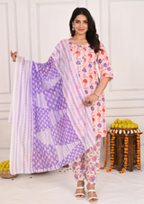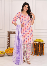 Step into elegance with this beautifully crafted off-white cotton kurta set. The kurta is intricately designed with a stunning red and purple floral print that adds a pop of color to the soft, neutral backdrop. The front buttons give it a classic touch, while the floral pants and matching dupatta complete the ensemble, creating a fresh and feminine look that’s perfect for any occasion.