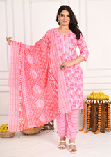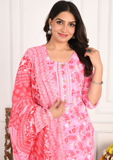 Charming Pink Floral Cotton Kurta Set with Lining Pant & Dupatta