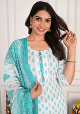 Fresh Green Floral Printed White Cotton Kurta Set with Bandhej Print Dupatta