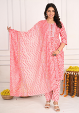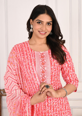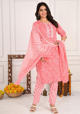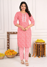 Add a touch of nature-inspired elegance to your wardrobe with this beautifully crafted cotton kurta set. The round neck kurta features a delicate leaf print, giving it a refreshing, earthy vibe. The sequins detailing, styled like buttons on the front, adds a subtle touch of glamour. Paired with trendy zigzag patterned pants and a matching dupatta, this set perfectly blends traditional elements with contemporary flair, making it ideal for various occasions.