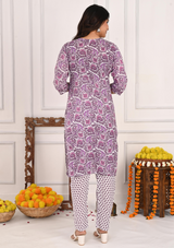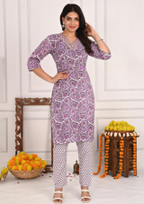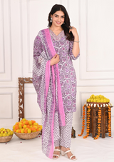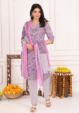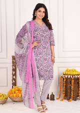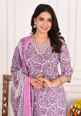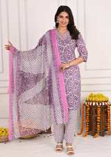 V Neck floral printed purple shade kurta white pant and dupatta set