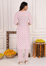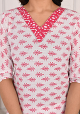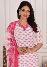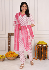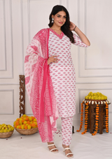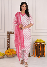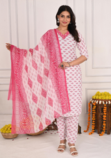Vibrant Red Bandej Print Cotton Kurta Set with White Pant & Dupatta