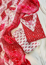 Add a splash of color and traditional charm to your ethnic collection with this stunning red bandej print kurta set. Crafted from soft, breathable pure cotton, this set features a striking bandej print on the kurta and dupatta, blending timeless tradition with modern elegance. The contrasting white pants complete the look, offering a chic and polished appearance. Perfect for festive occasions, casual gatherings, or semi-formal events, this set will keep you stylish and comfortable all day long.