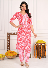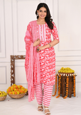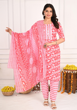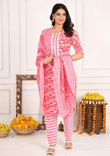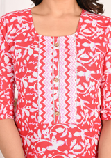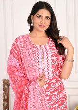 Vibrant Red Floral Cotton Kurta Set with Zigzag Pant & Dupatta