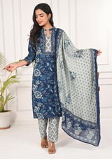 Add a touch of elegance to your wardrobe with this indigo floral printed 100% cotton kurta. Featuring a stylish mandarin collar and 3/4th sleeves, this straight-fit kurta is both comfortable and flattering. The calf-length design is paired with printed trousers and a soft mulmul dupatta, creating a chic, coordinated look perfect for both casual and festive occasions.